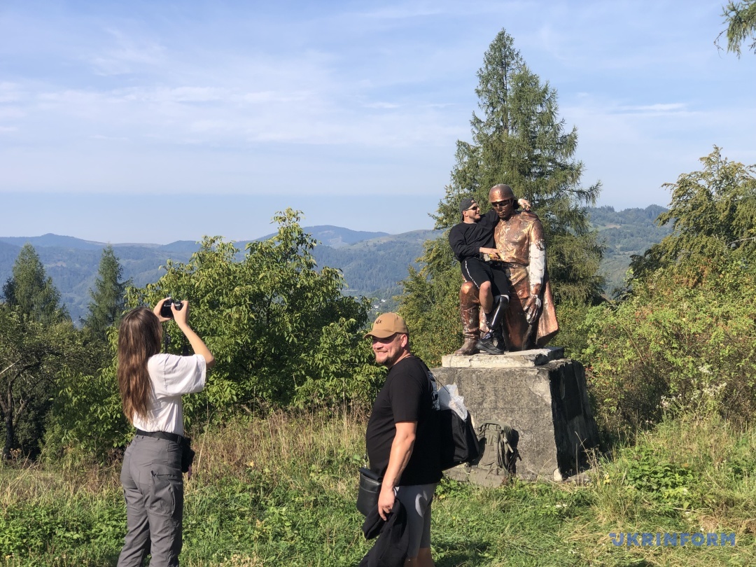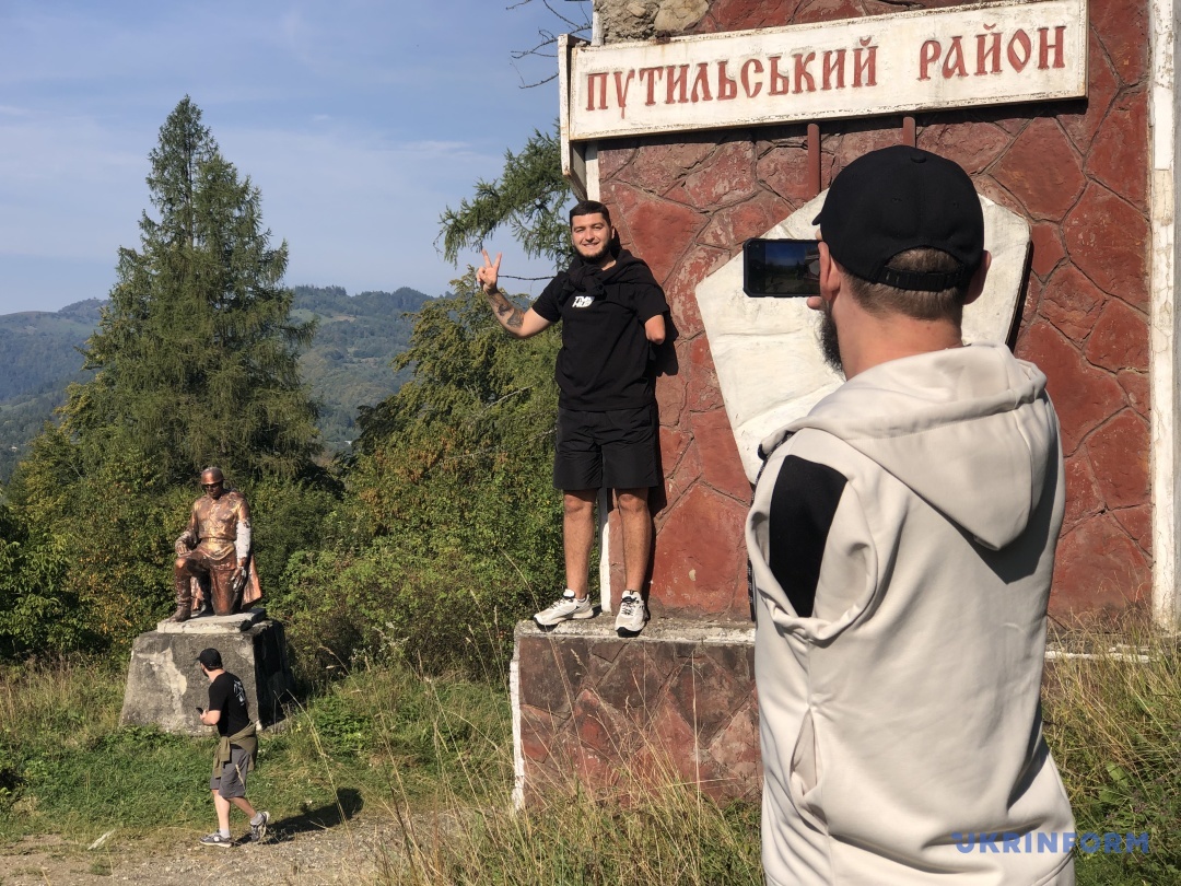 На перевалі Німчич ветерани почали фотографуватися. Хтось заліз на знак Путильський район, хтось у жарт фотографується із пам’ятником радянському воїну. Кілька хлопців підійшли до маленького кошеняти, який мило спав біля воріт місцевої жительки. Гладили тваринку, взяли її в руки, сфотографувались. Помічаю хлопця, який виніс із собою в сумці три нелегкі дерев’яні скульптури із вирізьбленими тризубами. Це херсонець Віталій із позивним «Кавун».