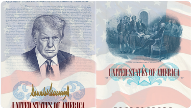 Як зазначається, на внутрішній обкладинці паспорта буде розміщено портрет чинного президента США, накладений на текст Декларації незалежності, а також його підпис золотистого кольору.