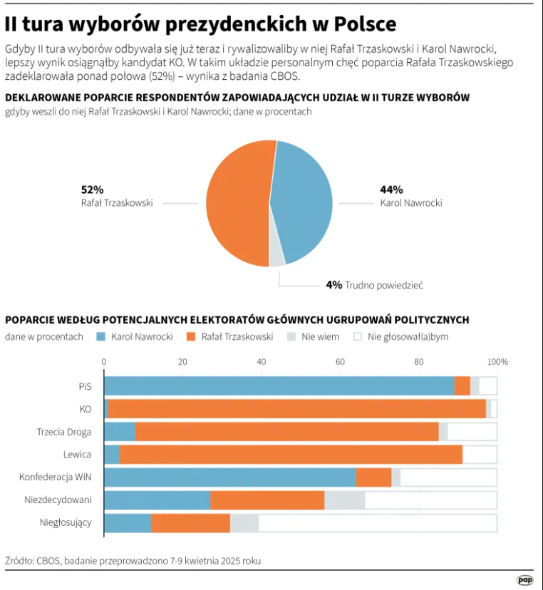Згідно з опитуванням центру CBOS, станом на сьогодні Тшасковський перемагає у другому турі як з кандидатом за підтримки правоконсервативної «Право і Справедливість» (PiS) Каролем Навроцьким так і представником націоналістичної «Конфедерації» Славоміром Менцтеном, передає Укрінформ з посиланням на PAP.