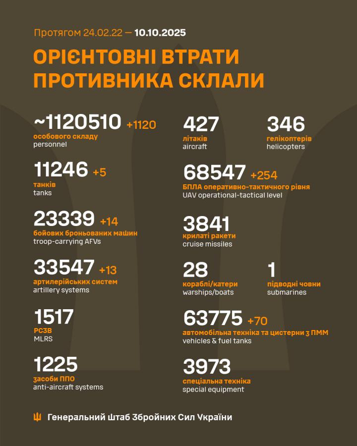 Загальні бойові втрати російських військ у живій силі з 24 лютого 2022 року по 10 жовтня 2025-го сягнули близько 1 120 510 осіб, з них 1120 – ліквідовані за останню добу.