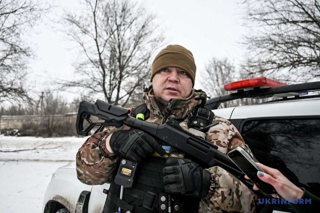 На варті з антидроновою рушницею постійно чергує поліцейський офіцер громади Дмитро Бєсєдін. Він і за водія, і прикриває групу від дронів.