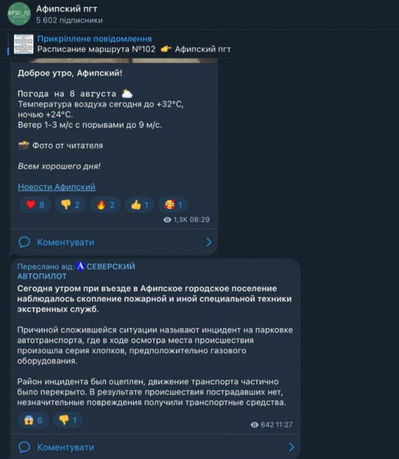 У ГУР поінформували, що місцеві ЗМІ і пабліки у соцмережах відразу повідомили про два вибухи в смт Афіпське і що місцеві спецслужб перекрили район та запровадили режим «антитерористичної операції».