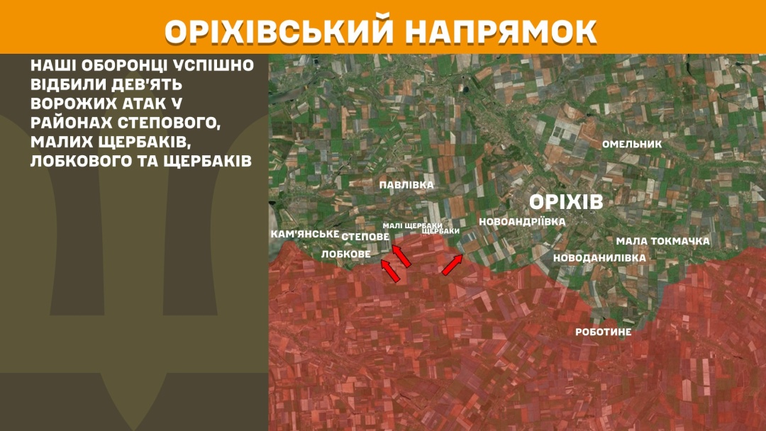 На Оріхівському напрямку оборонці України успішно відбили дев’ять ворожих атак у районах Степового, Малих Щербаків, Лобкового та Щербаків.