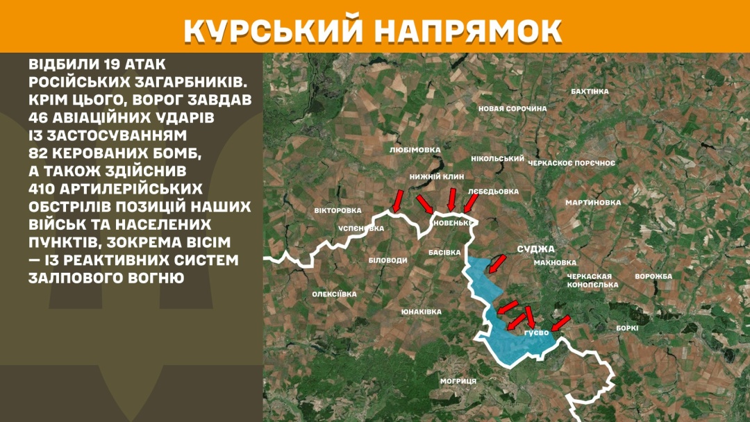 В операційній зоні в Курській зоні РФ підрозділи Сил оборони України відбили 19 російських атак. Загарбники завдали 46 авіаційних ударів із застосуванням 82 керованих бомб, а також здійснили 410 артилерійських обстрілів позицій наших військ та населених пунктів, зокрема вісім — із реактивних систем залпового вогню.