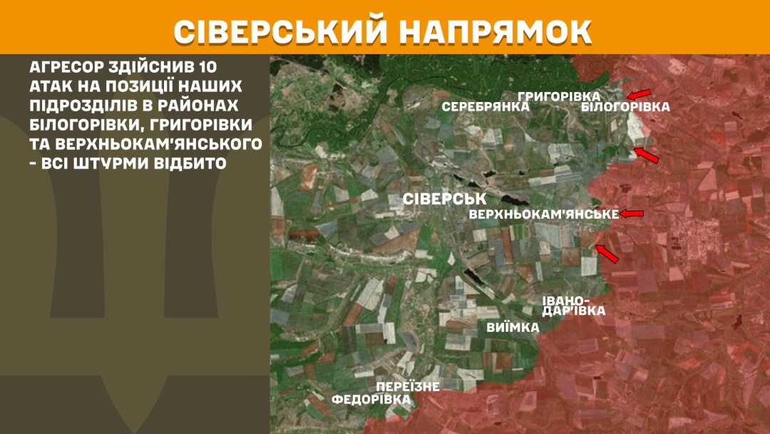 На Сіверському напрямку армія РФ здійснила 10 атак у районах Білогорівки, Григорівки та Верхньокам’янського. Усі штурми відбиті.