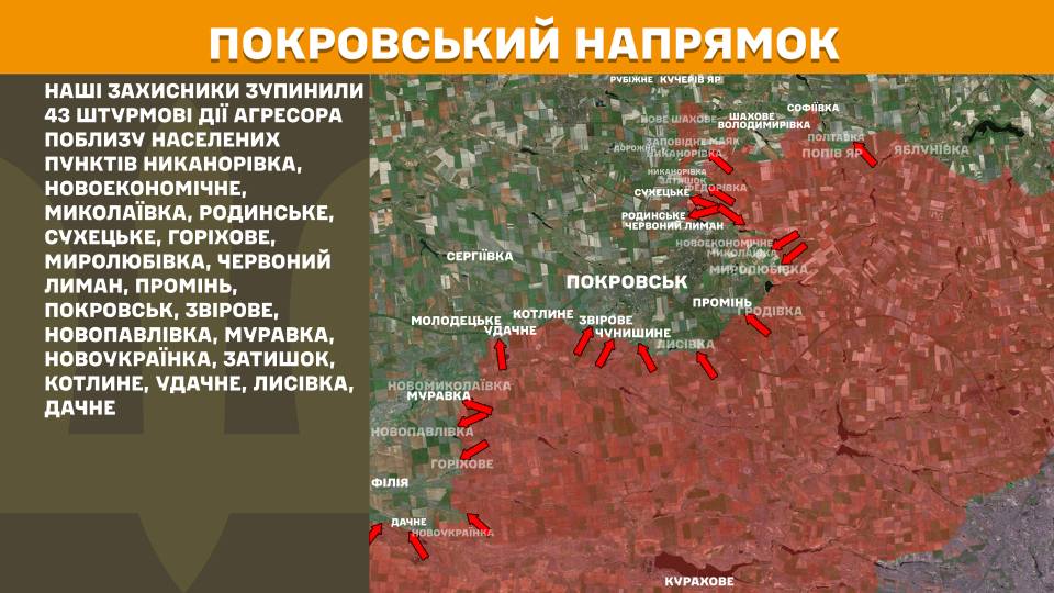 На Покровському напрямку протягом минулої доби українські захисники зупинили 43 штурмові дії агресора поблизу населених пунктів Никанорівка, Новоекономічне, Миколаївка, Родинське, Сухецьке, Горіхове, Миролюбівка, Червоний Лиман, Промінь, Покровськ, Звірове, Новопавлівка, Муравка, Новоукраїнка, Затишок, Котлине, Удачне, Лисівка, Дачне.