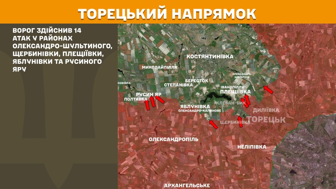 На Торецькому напрямку ворог здійснив 14 атак у районах Олександро-Шультиного, Щербинівки, Плещіївки, Яблунівки та Русиного Яру.