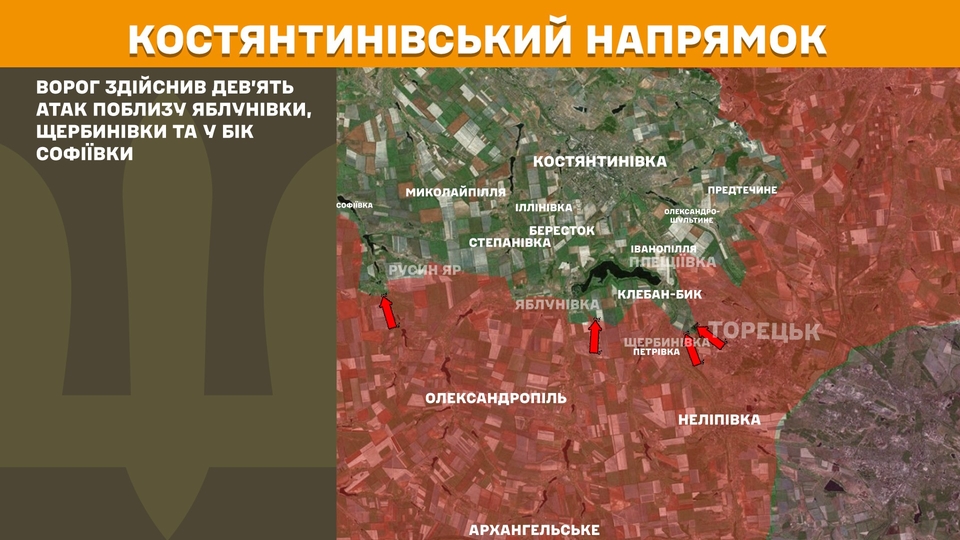 На Костянтинівському напрямку загарбники здійснили дев’ять атак поблизу Яблунівки, Щербинівки та у бік Софіївки.