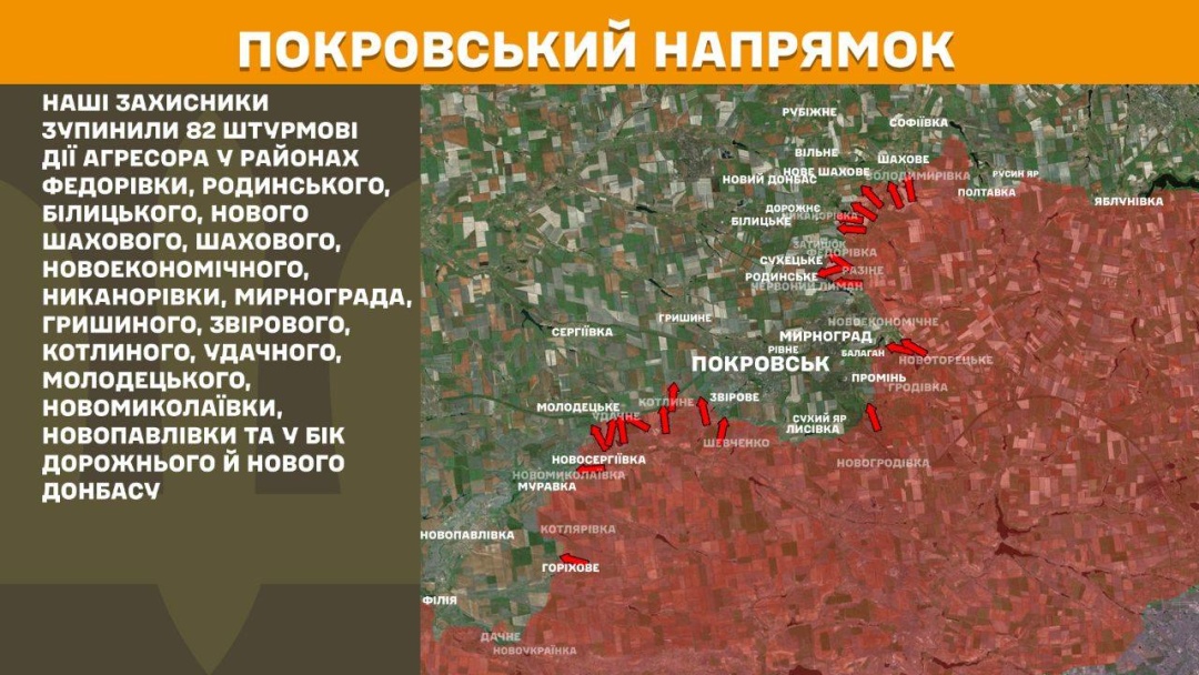 На Покровському напрямку захисники України зупинили 82 штурмові дії загарбників у районах Федорівки, Родинського, Білицького, Нового Шахового, Шахового, Новоекономічного, Никанорівки, Мирнограда, Гришиного, Звірового, Котлиного, Удачного, Молодецького, Новомиколаївки, Новопавлівки та у бік Дорожнього і Нового Донбаса.