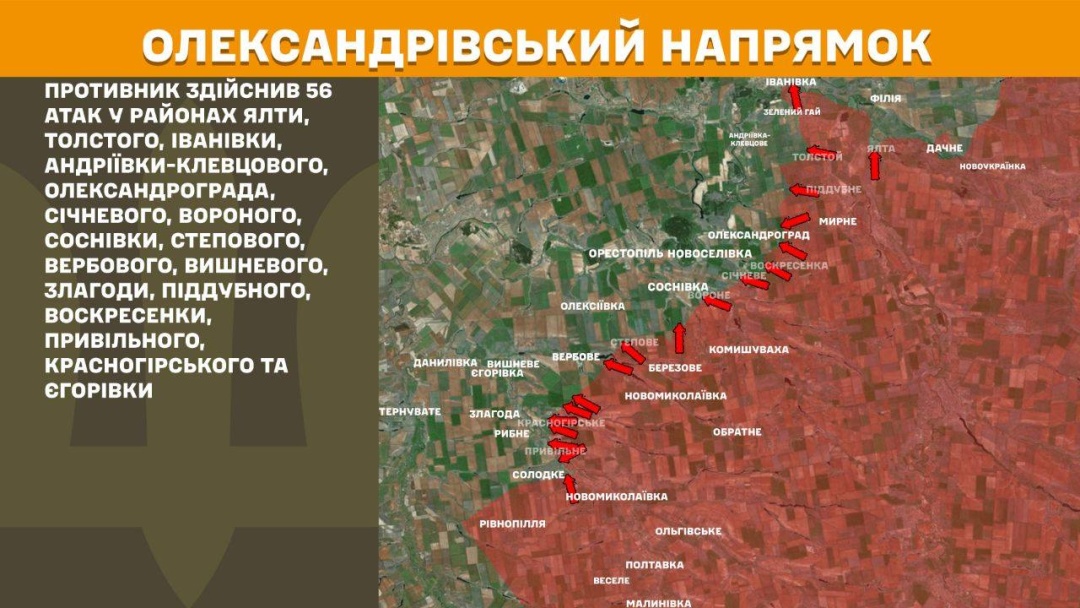 На Олександрівському напрямку ворог здійснив 56 атак у районах Ялти, Толстого, Іванівки, Андріївки-Клевцового, Олександрограда, Січневого, Вороного, Соснівки, Степового, Вербового, Вишневого, Злагоди, Піддубного, Воскресенки, Привільного, Красногірського та Єгорівки.