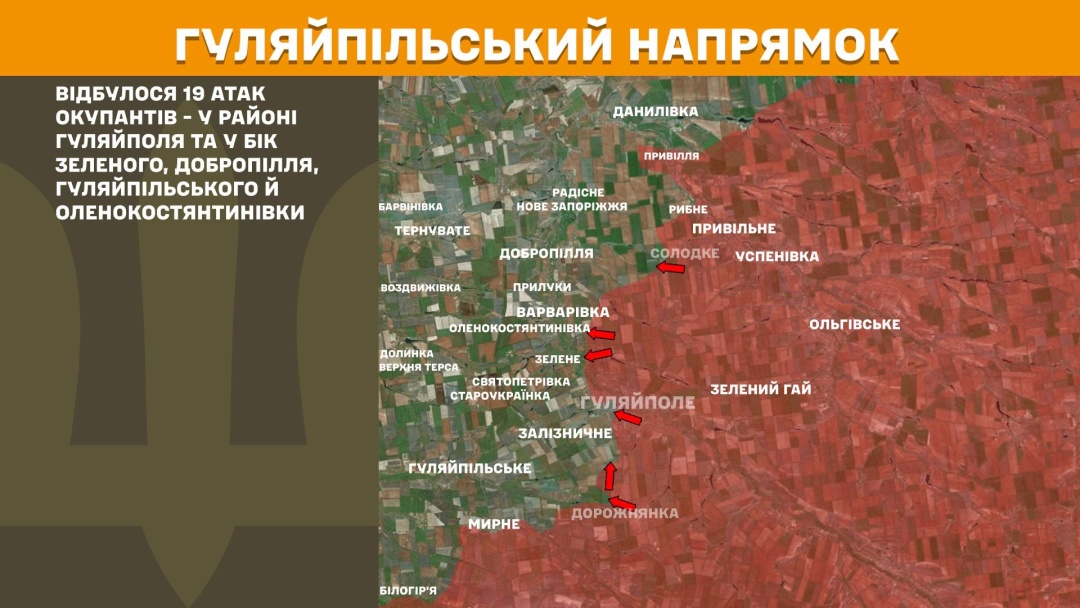 На Гуляйпільському напрямку сталося 19 російських атак у районі Гуляйполя та в бік Зеленого, Добропілля, Гуляйпільського й Оленокостянтинівки.