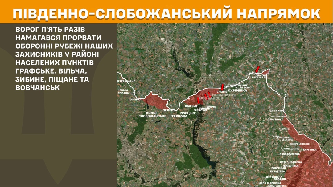 На Південно-Слобожанському напрямку ворог п’ять разів намагався прорвати оборонні рубежі у районі Графського, Вільчі, Зибиного, Піщаного та Вовчанська.