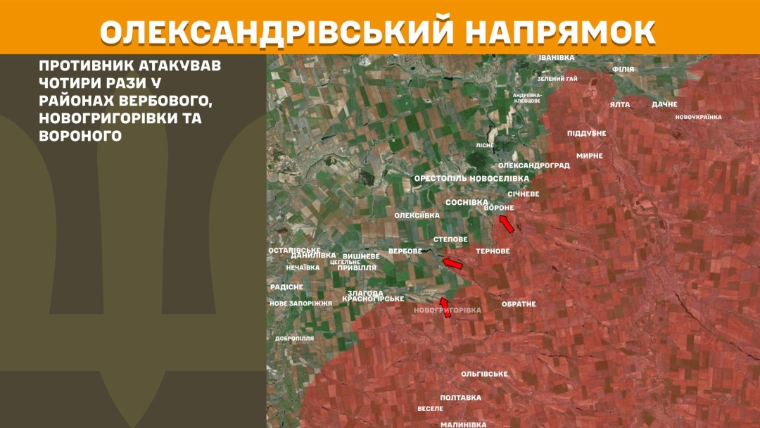На Олександрівському напрямку ворог атакував чотири рази у районах Вербового, Новогригорівки та Вороного.