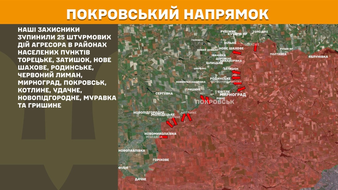 На Покровському напрямку Сили оборони зупинили 25 штурмових дій армії РФ в районах Торецького, Затишка, Нового Шахового, Родинського, Червоного Лимана, Мирнограда, Покровська, Котлиного, Удачного, Новопідгородного, Муравки та Гришиного.