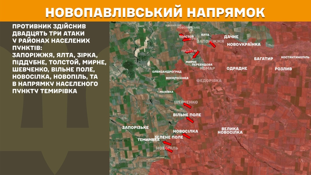 На Новопавлівському напрямку противник вчора здійснив 23 атаки у районах населених пунктів: