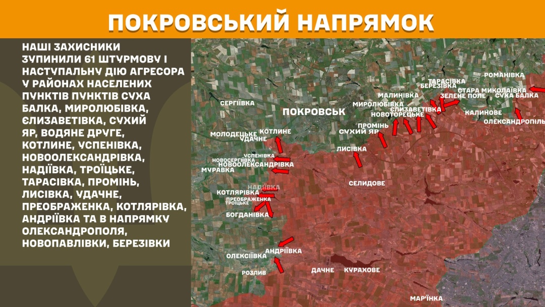На Покровському напрямку наші захисники зупинили 61 штурмову і наступальну дію агресора у районах населених пунктів Суха Балка, Миролюбівка, Єлизаветівка, Сухий Яр, Водяне Друге, Котлине, Успенівка, Новоолександрівка, Надіївка, Троїцьке, Тарасівка, Промінь, Лисівка, Удачне, Преображенка, Котлярівка, Андріївка та в напрямку Олександрополя, Новопавлівки, Березівки.