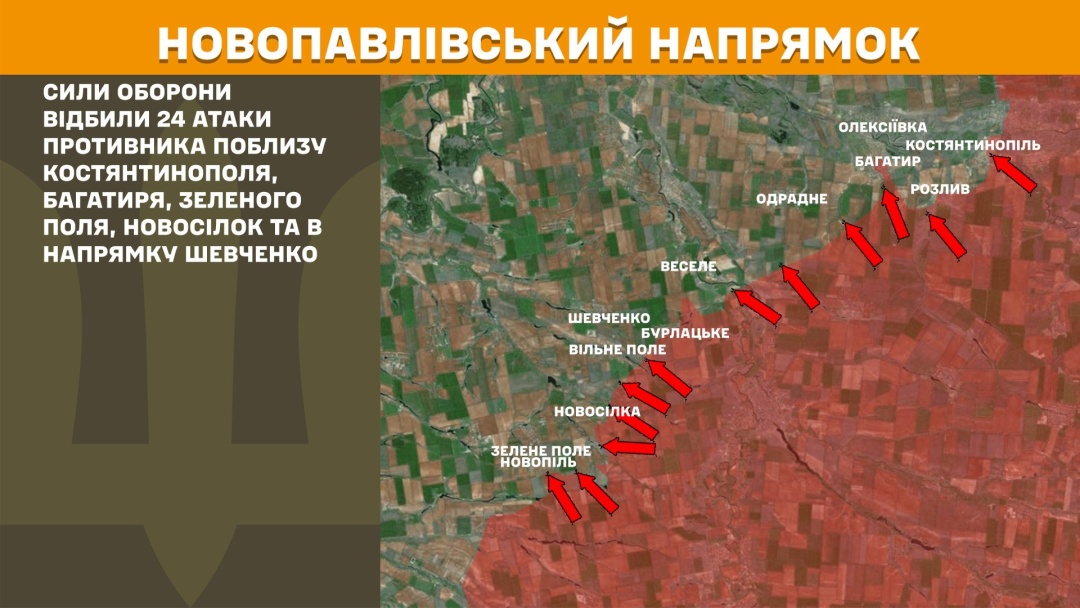 На Новопавлівському напрямку Сили оборони відбили 24 російські атаки поблизу Костянтинополя, Багатиря, Зеленого Поля, Новосілок та в напрямку Шевченко.