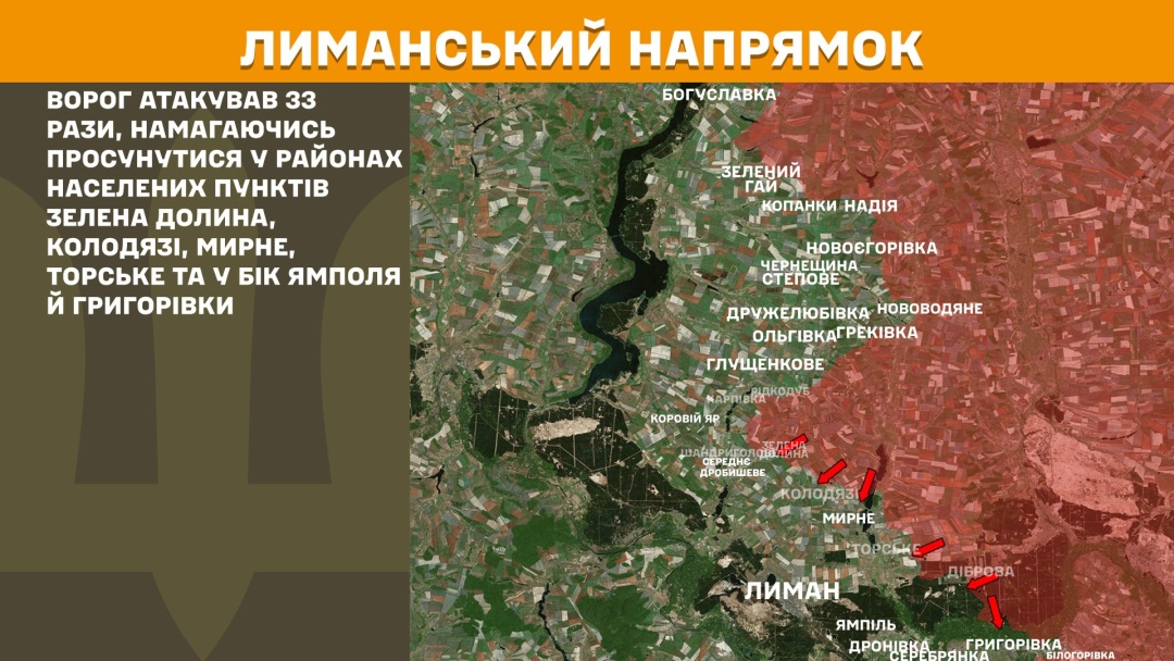 На Лиманському напрямку армія РФ атакувала 33 рази, зокрема намагалась просунутися у районах населених пунктів Зелена Долина, Колодязі, Мирне, Торське та у бік Ямполя й Григорівки.
