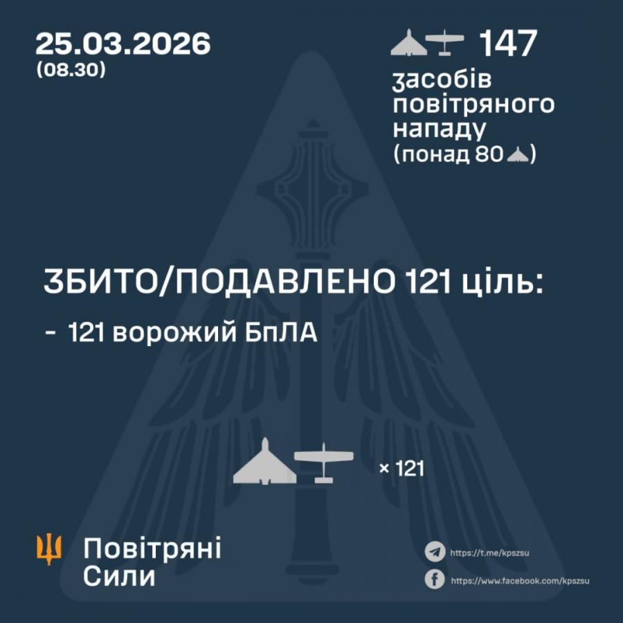 За попередніми даними, станом на 08:30 середи, 25 березня, протиповітряна оборона збила / подавила 121 дрон на півночі, півдні та сході України.