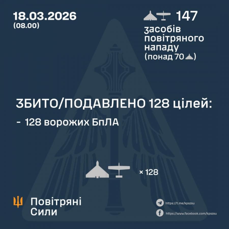 За попередніми даними, станом на 08:00, середи, 18 березня, ППО збила / подавила 128 ворожих безпілотників на півночі, півдні та сході України.