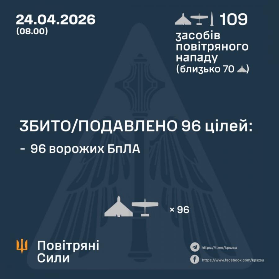 За попередніми даними, станом на 08:00 п’ятниці, 24 квітня, ППО збила / подавила 96 дронів на півночі, півдні та сході країни.