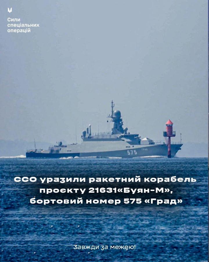 Щодо ракетного корабля, Сили спеціальних операцій ЗСУ зазначили у Фейсбуці, що їхні підрозділи завдали по ньому удару о 04:31 суботи.