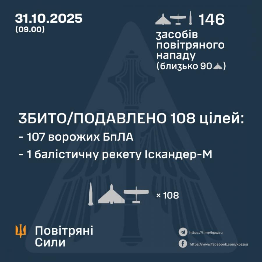За попередніми даними, станом на 09:00 п’ятниці, 31 жовтня, протиповітряною обороною збито/подавлено одну балістичну ракету та 107 ворожих безпілотників типу Shahed, Гербера і дронів інших типів на півночі, півдні та сході країни.