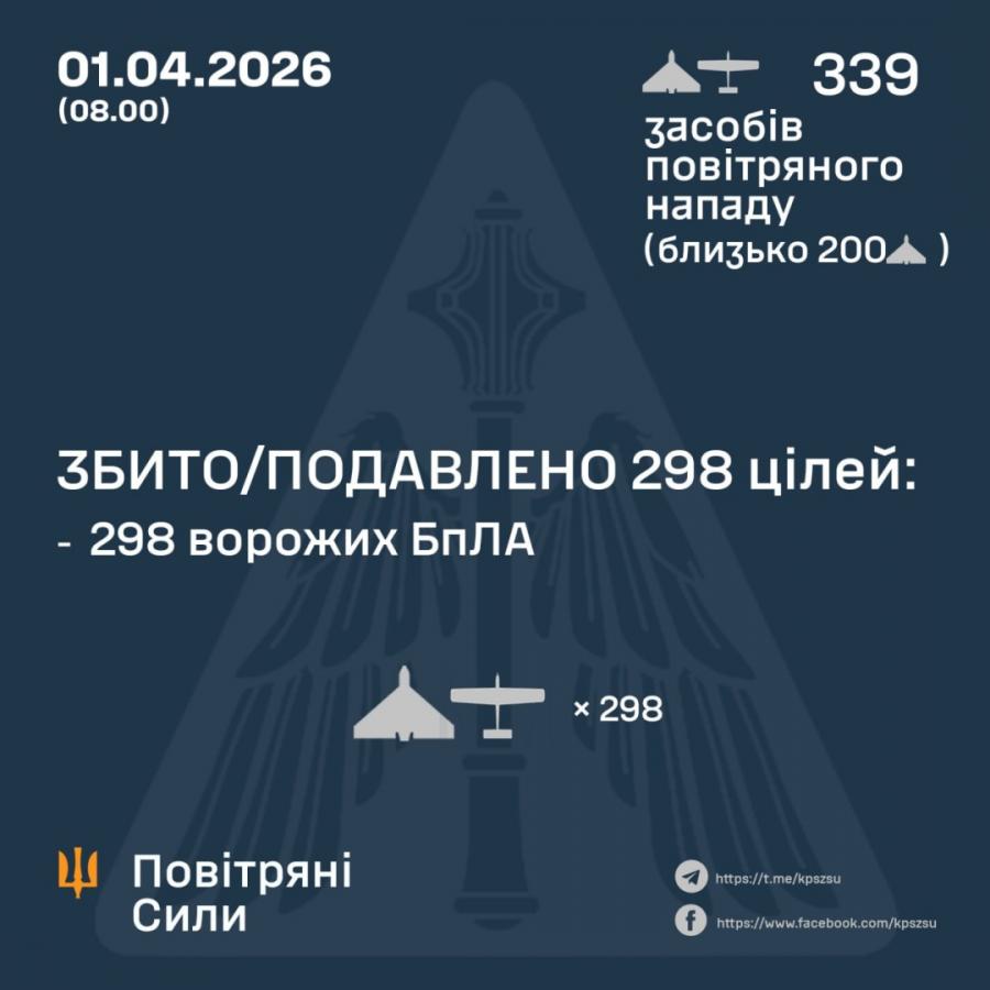 За попередніми даними, станом на 08:00 середи, 1 квітня, протиповітряна оборона збила / подавила 298 безпілотників інших типів на півночі, півдні, сході, заході та в центрі України.