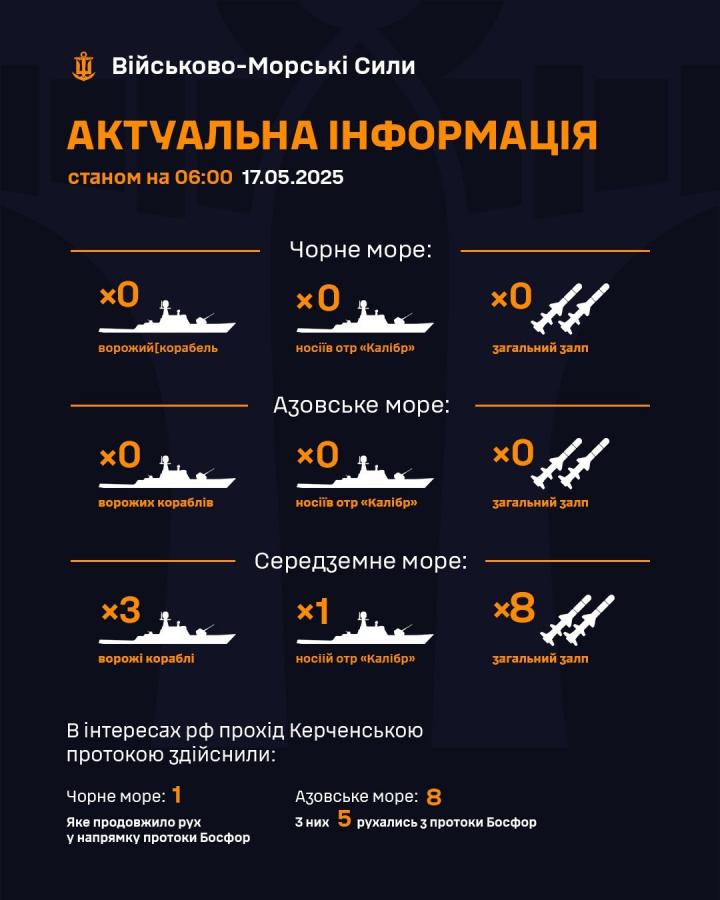 Наразі, за даними ВМС ЗСУ, в Середземному морі перебувають 3 ворожі кораблі, з яких 1 є носієм крилатих ракет "Калібр" загальним залпом до 8 ракет.