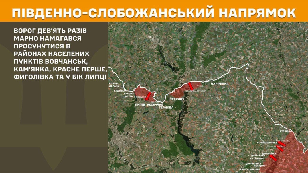 На Південно-Слобожанському напрямку росіяни дев’ять разів марно намагалися просунутися в районах Вовчанська, Кам’янки, Красного Першого, Фиголівки та в бік Липців.