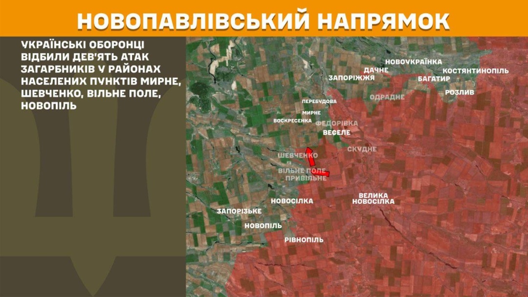 На Новопавлівському напрямку українські оборонці відбили дев’ять ворожих атак у районах Мирного, Шевченка, Вільного Поля й Новополя.